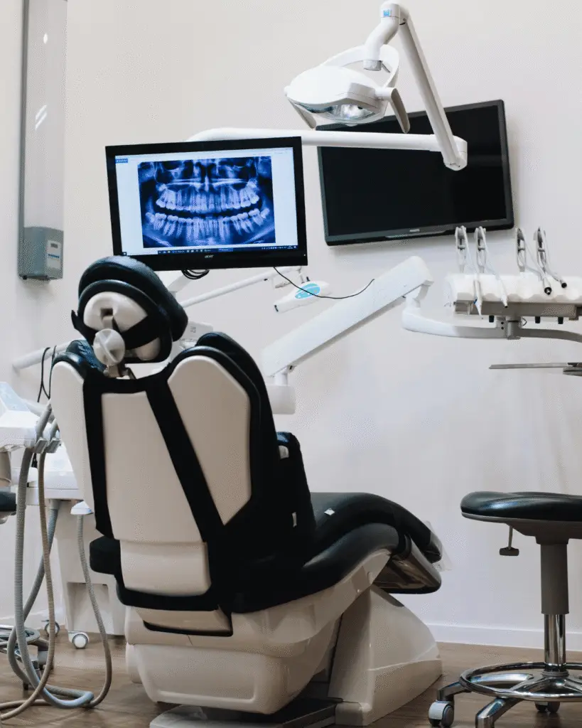 Dentist examining dental X-rays on a computer screen in a clinic.